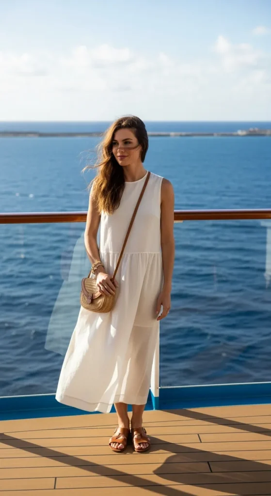 A sleeveless ivory linen dress is the definition of effortless cruise elegance. Its breathable structure and soft drape make it perfect for long, relaxed days at sea.