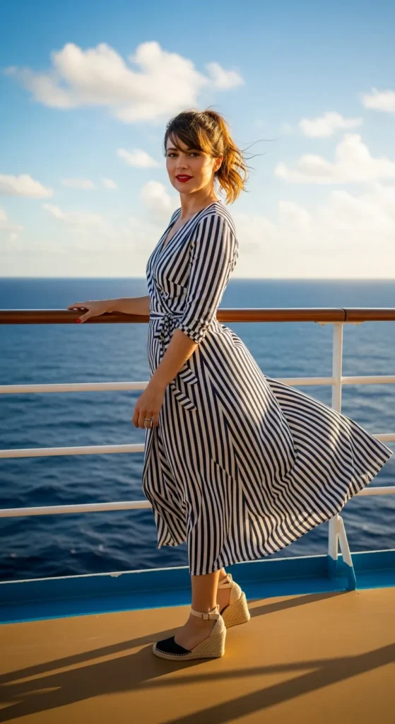 A classic navy and white striped wrap dress feels timeless for cruise days. The cinched waist flatters the figure while the wrap design adds movement and effortless coastal charm.