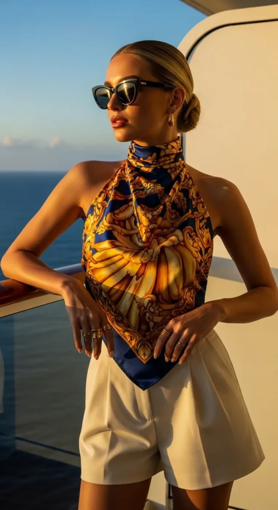 A silk scarf-style halter top paired with tailored shorts creates a modern cruise-chic look. The glossy fabric adds luxury while still feeling lightweight and summer-ready.