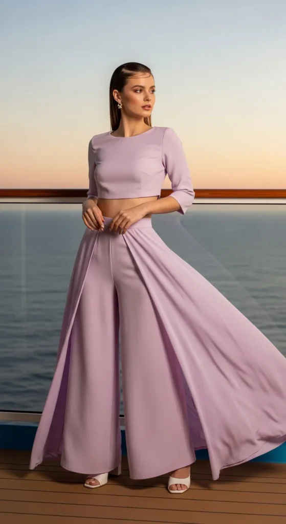 A pastel palazzo pants set with a cropped top brings a soft, modern cruise aesthetic. The flowing pants add movement, while pastel tones like lavender or mint feel fresh against ocean surroundings.