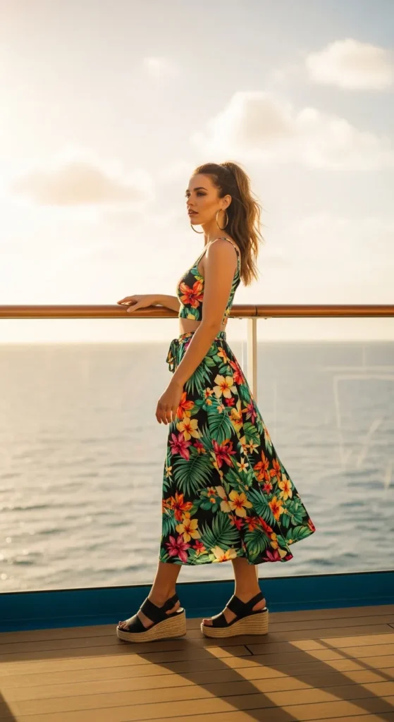 A tropical print midi skirt paired with a fitted crop top adds playful energy to cruise fashion. The vibrant patterns reflect the joy of summer travel and island-inspired vibes.