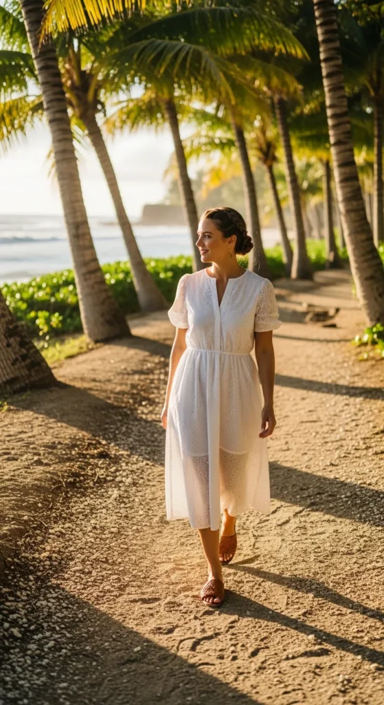 A white eyelet dress captures that classic tropical romance. It feels fresh against sun-kissed skin and photographs beautifully against palm trees.