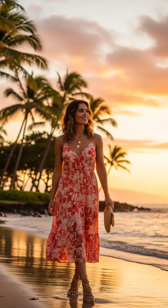 A soft floral midi dress in sunset tones moves beautifully in the island breeze. It’s romantic yet effortless, ideal for sunset dinners overlooking the ocean or a relaxed luau evening.