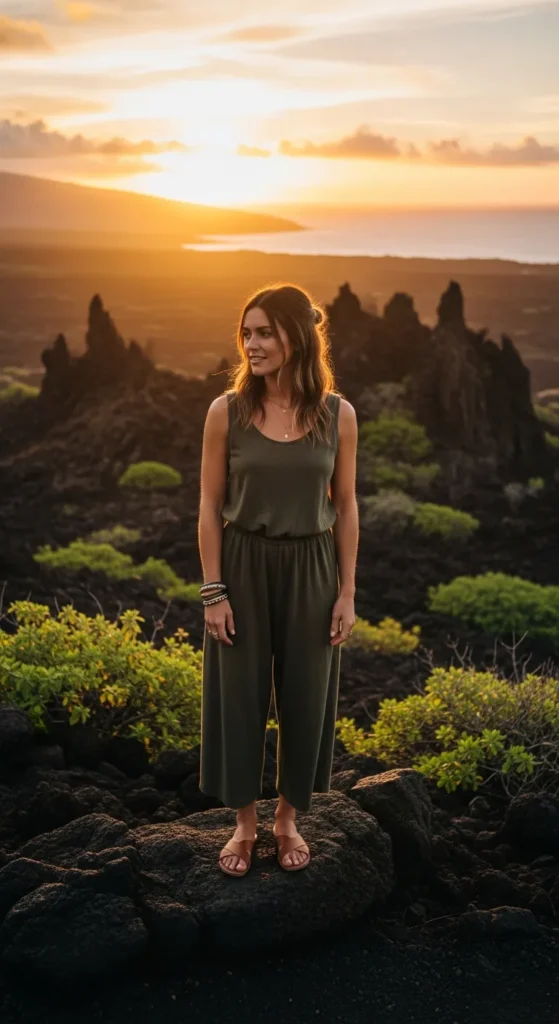 A breathable wide-leg jumpsuit in muted olive or sand tones feels effortless and put-together. It works beautifully from daytime tours to relaxed evening dinners.