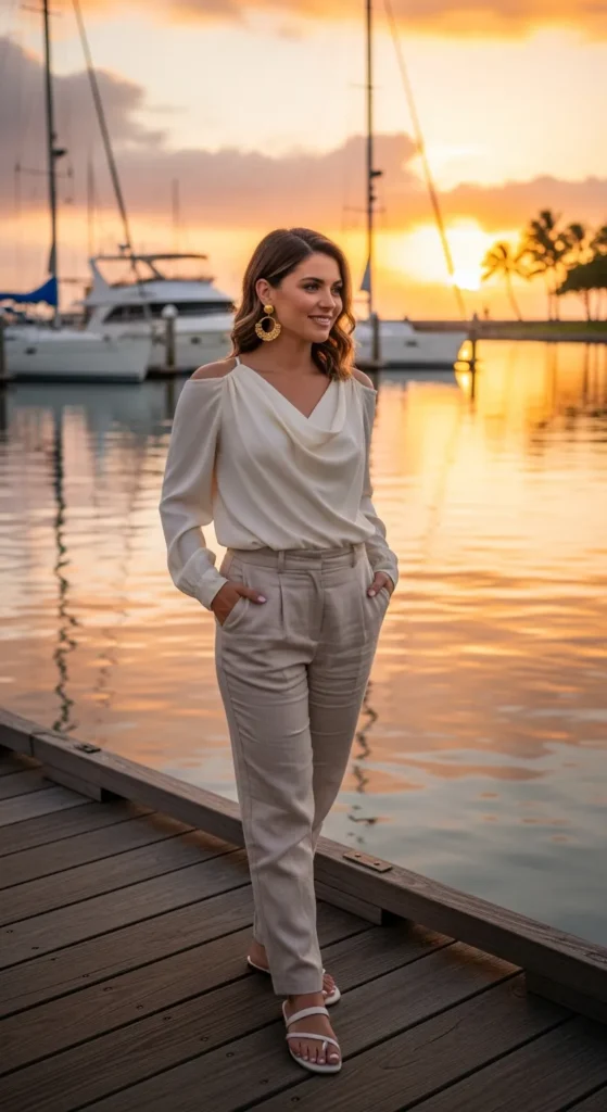 An off-shoulder top paired with tailored linen trousers creates an elevated yet breathable silhouette. It feels perfect for sunset cocktails by the water.