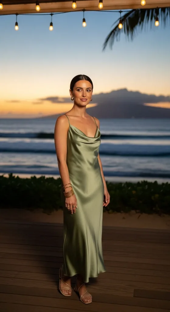 A lightweight satin slip dress in soft champagne or sage glides over sun-kissed skin. It’s minimal, elegant, and perfect for oceanfront dinners under string lights.