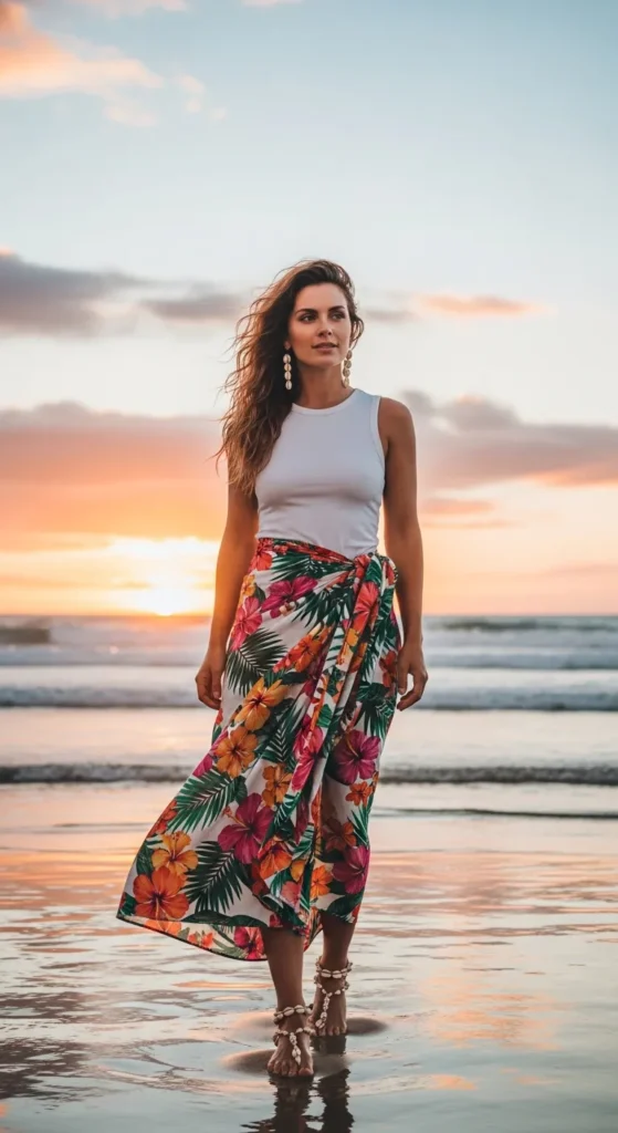A simple fitted tank tucked into a printed sarong skirt gives you versatility and movement. It’s comfortable for beach days yet styled enough for oceanfront cafés.