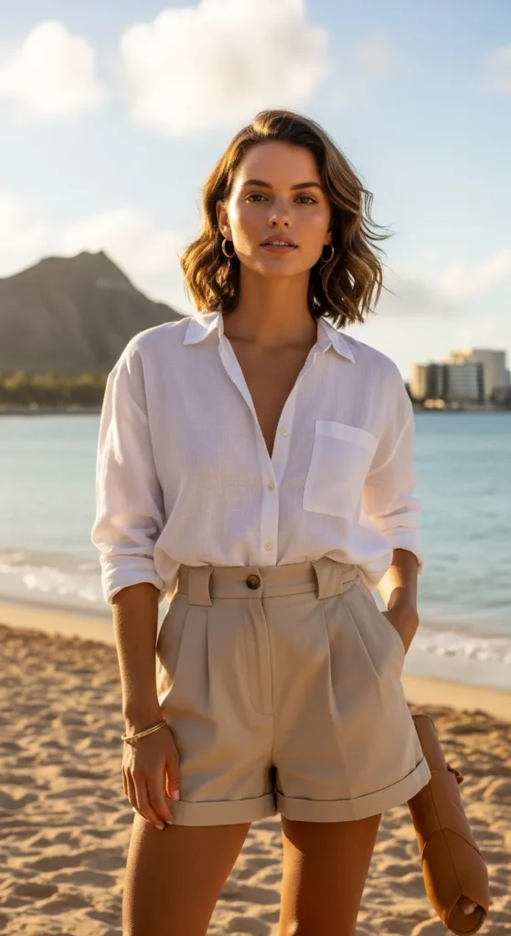 A crisp white linen button-down loosely tucked into high-waisted beige shorts feels timeless and fresh against Hawaii’s turquoise waters. It’s polished without trying too hard, and perfectly breathable for long beachside brunches.