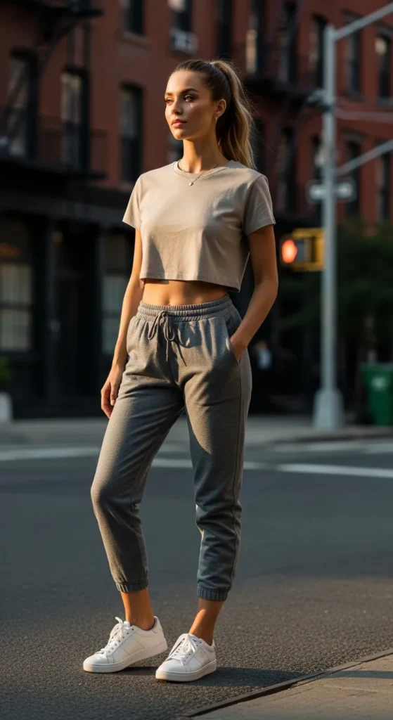 A cropped tee and joggers create that perfect mix of relaxed and flattering. It’s casual but still defines your silhouette in a subtle way.