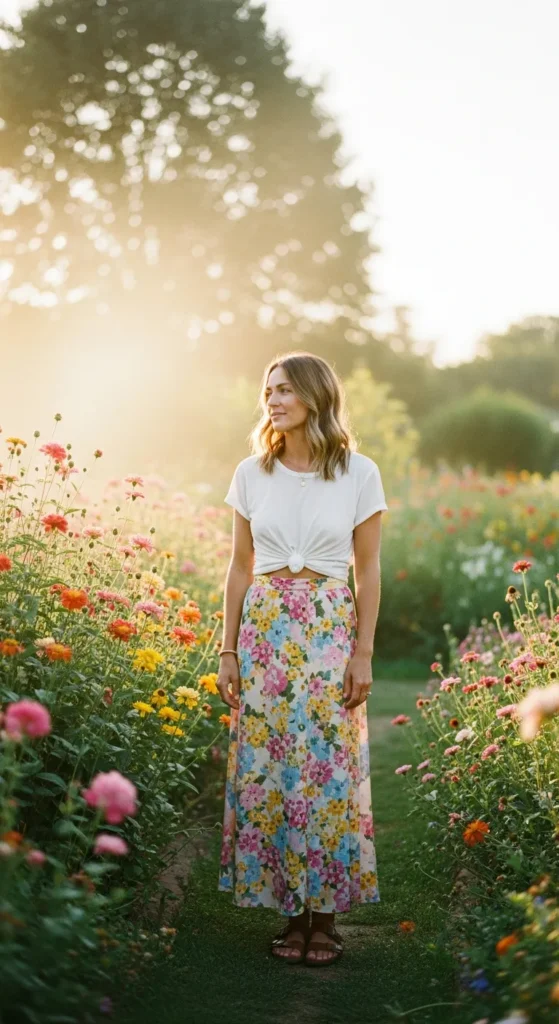 A flowy maxi skirt paired with a simple tee feels romantic without trying too hard. The movement of the skirt adds an effortless elegance to a basic piece.