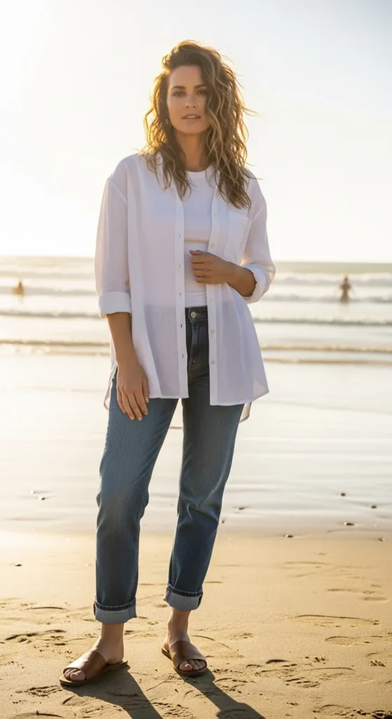 A lightweight linen shirt paired with relaxed-fit jeans gives off an easy, coastal vibe. It’s breathable, simple, and perfect for slow summer afternoons.