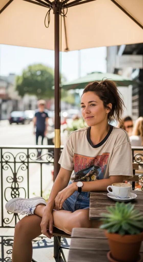 A slightly faded graphic tee tucked into soft denim shorts gives off that nostalgic, easygoing vibe. It’s a throw-on-and-go outfit that still feels expressive and personal.