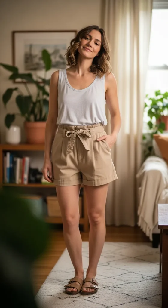 Paperbag shorts add shape while a loose tank keeps things relaxed. It’s an easy outfit that feels comfortable yet slightly styled.
