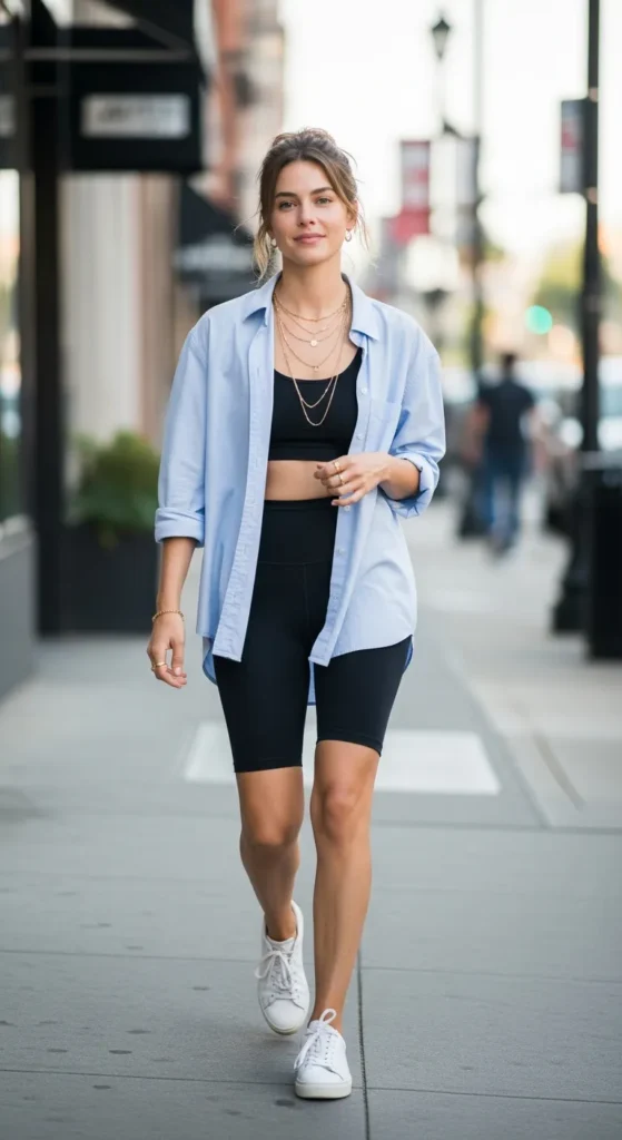 An oversized button-down instantly elevates simple biker shorts, creating a look that feels both relaxed and styled. It’s perfect for those in-between moments, running errands or lounging with intention.