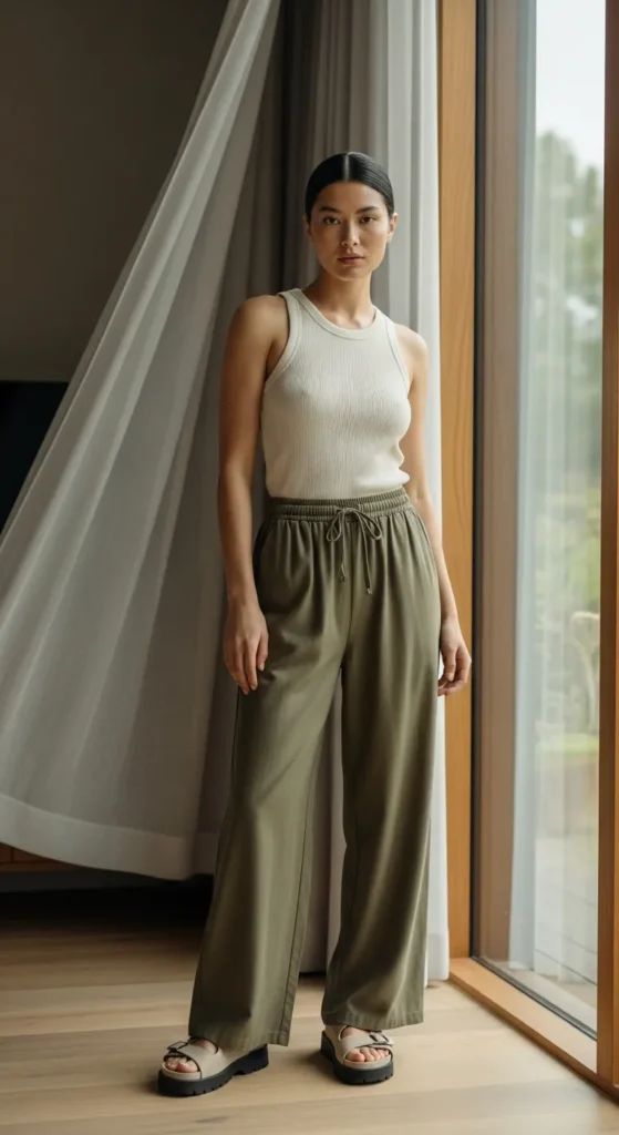 A fitted ribbed tank paired with loose drawstring pants creates that perfect contrast of structure and flow. It’s breathable, flattering, and ideal for long, unhurried summer days.