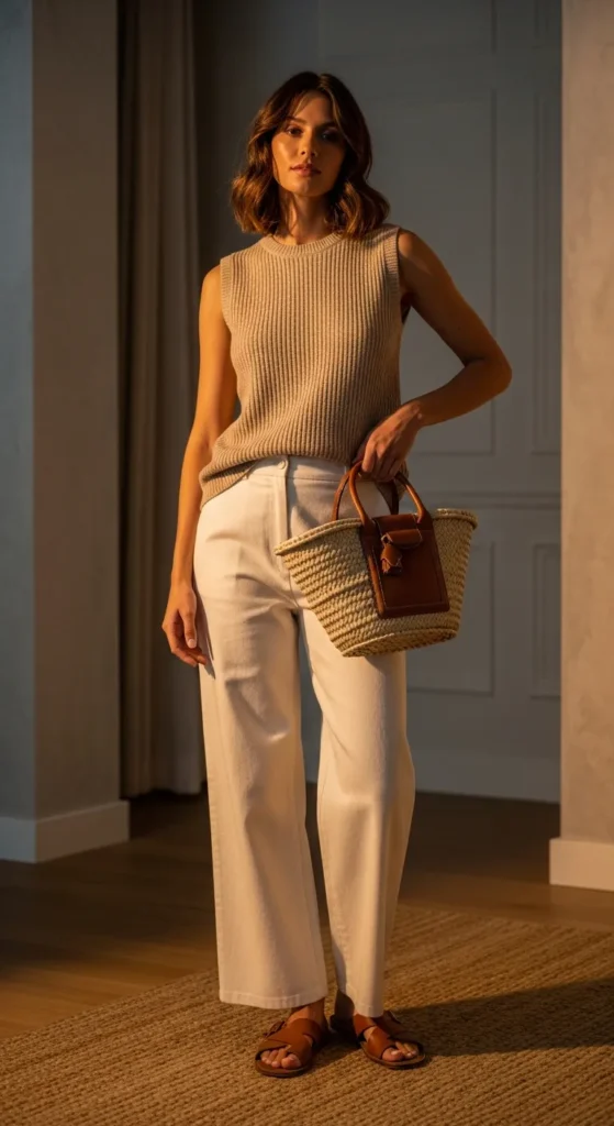 A sleeveless knit top adds texture while wide-leg pants bring flow. Together, they create a soft yet structured outfit that feels elevated but still relaxed.