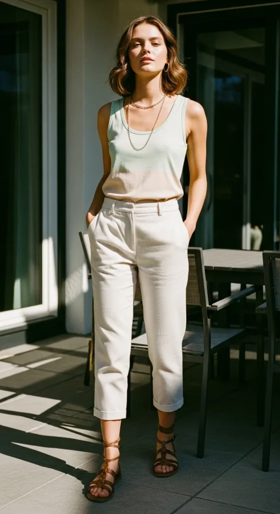 High-waist cropped linen pants in light cream paired with a pastel tank top provide an effortless summer silhouette. Perfect balance between casual and chic, keeping you cool in the sun.