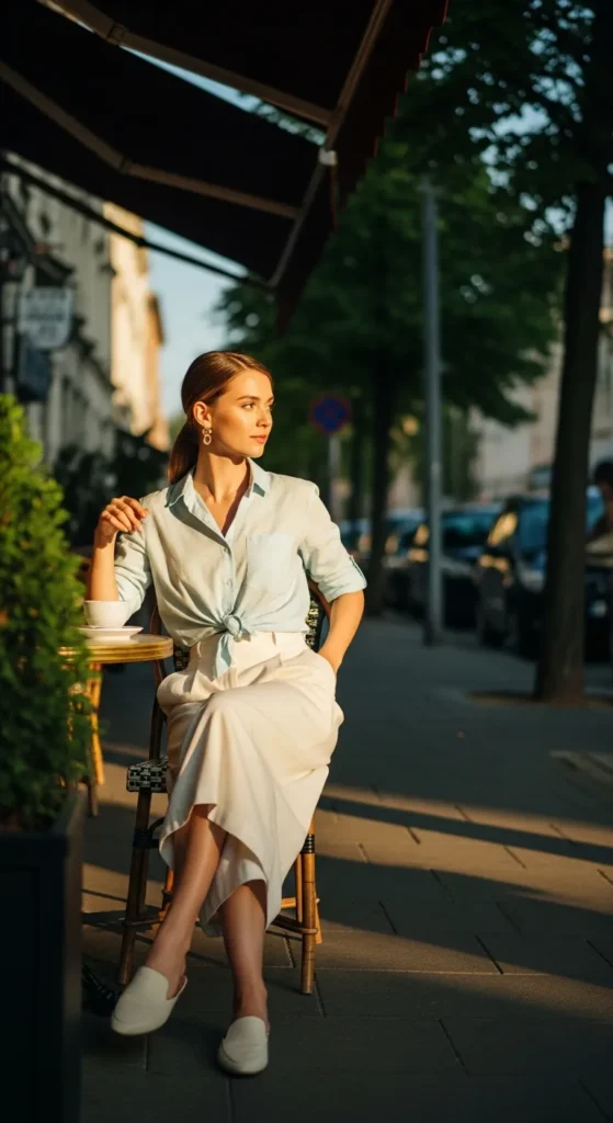 A pastel pleated skirt paired with a sleeveless silk blouse creates a sophisticated yet breezy ensemble. The light fabrics catch sunlight beautifully, adding movement and dimension.