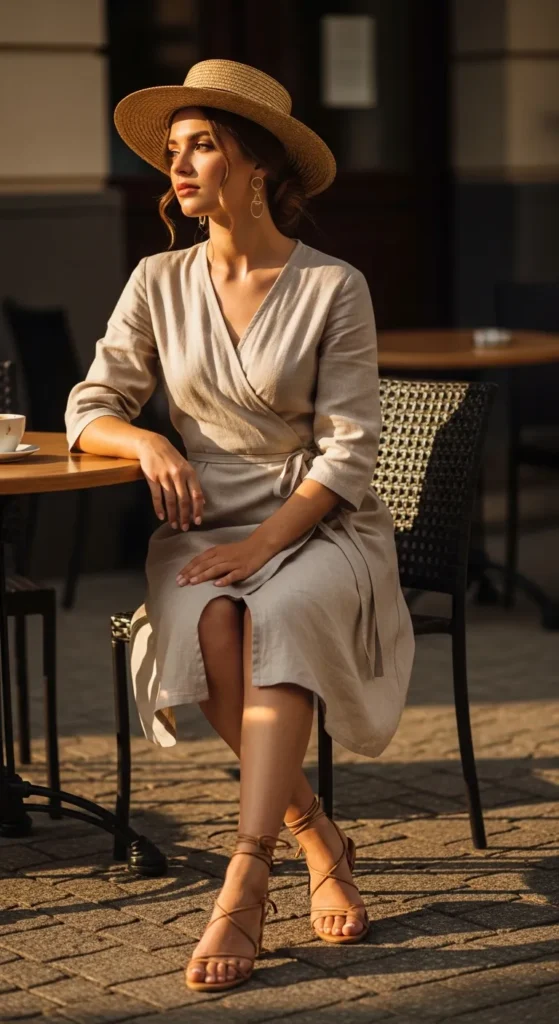 A soft beige linen wrap dress flows gracefully, cinching at the waist with a thin tie. Pair it with strappy sandals for a breezy, light summer feel that balances casual and polished effortlessly.