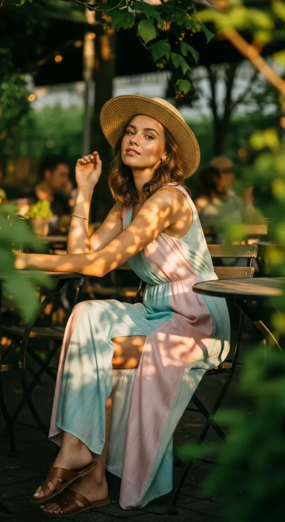 A flowy, pastel maxi dress with a subtle side slit combines elegance and comfort. The slit adds movement and breathability for sunny outdoor lunches.