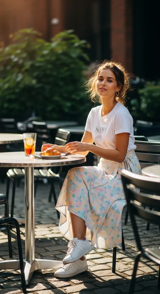 Stylist Suggestion: Slide into white canvas sneakers and a small crossbody bag. This keeps the outfit playful and practical for walking between cafes.