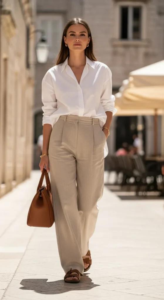 A relaxed white button-down paired with wide-leg linen trousers instantly creates that polished old money summer energy. The breathable fabrics keep the outfit comfortable while the clean lines maintain an effortlessly sophisticated appearance.