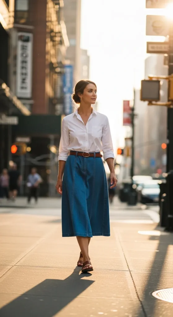 Pairing a crisp white shirt with a structured denim midi skirt creates a refined yet approachable outfit. It blends timeless tailoring with casual texture in a way that feels relaxed but still elegant.