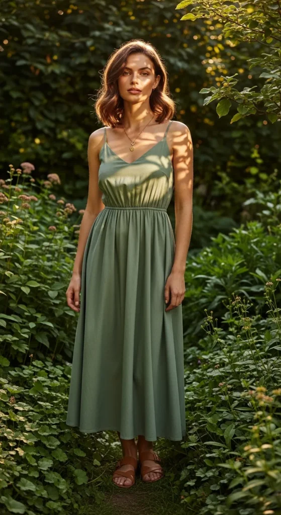 A soft cotton sundress in muted sage or cream captures the quiet luxury of summer perfectly. Its flowy silhouette feels feminine and breezy, making it ideal for garden walks, café mornings, or relaxed vacation days.
