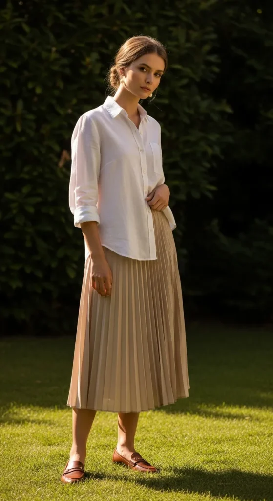 A crisp ivory linen shirt tucked into a soft beige pleated midi skirt creates an effortlessly refined summer look. The airy fabrics move beautifully with every step, giving you that graceful, understated elegance that old money style embodies.
