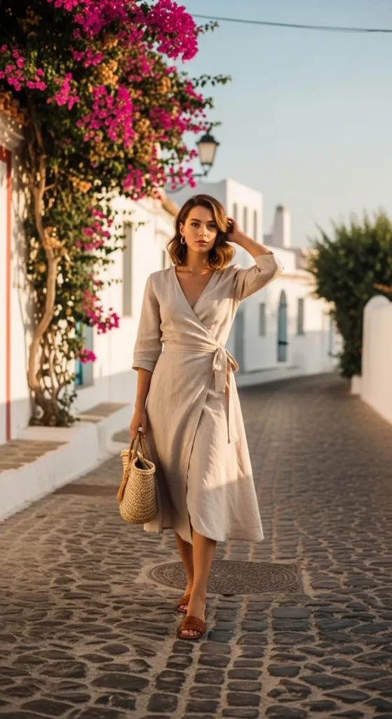A linen wrap dress naturally flatters the silhouette while keeping you cool during hot summer days. The wrap shape adds a touch of femininity while maintaining that effortless, graceful energy.