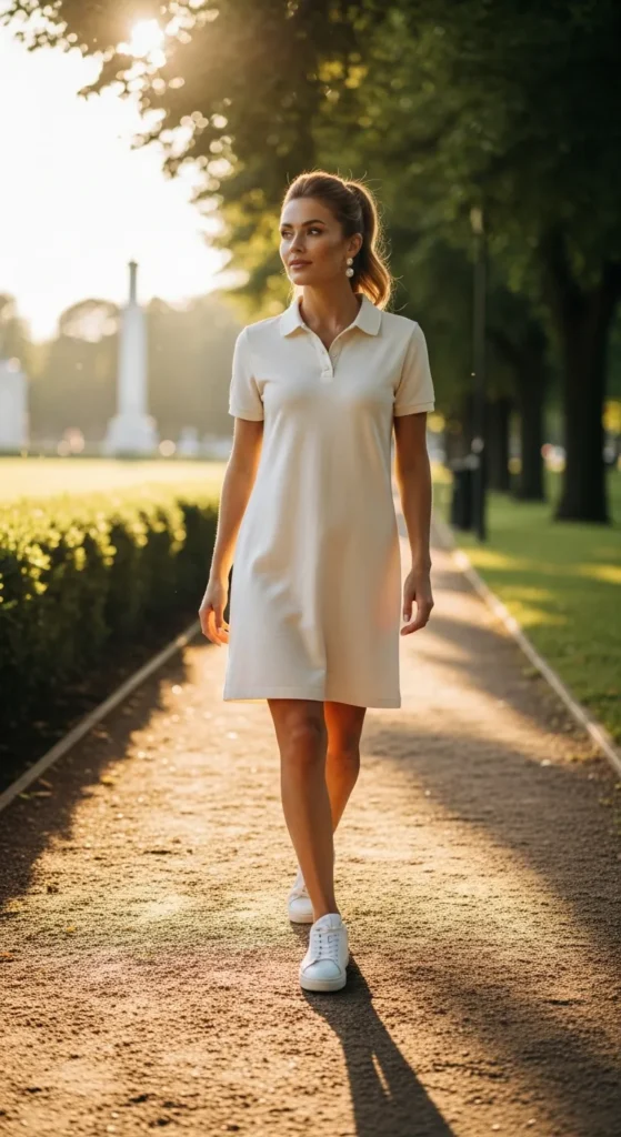 A fitted cotton polo dress blends sporty comfort with polished simplicity. Its clean silhouette makes it an easy go-to outfit that still aligns beautifully with the refined old money aesthetic.