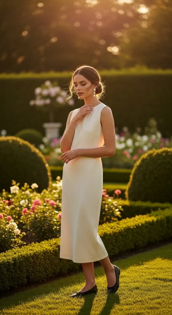 A simple sleeveless midi dress in a neutral tone captures the essence of effortless elegance. Its clean lines make it easy to style while still looking graceful and timeless.