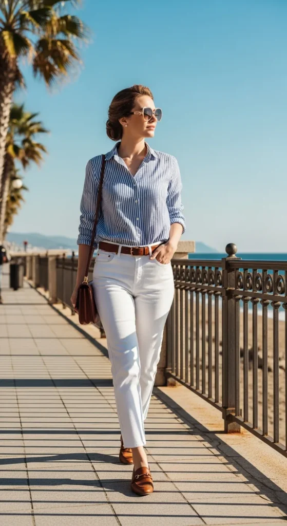 A classic striped button-down tucked into white straight-leg jeans creates a clean nautical-inspired outfit. It’s relaxed yet polished, making it perfect for summer afternoons that call for easy elegance.
