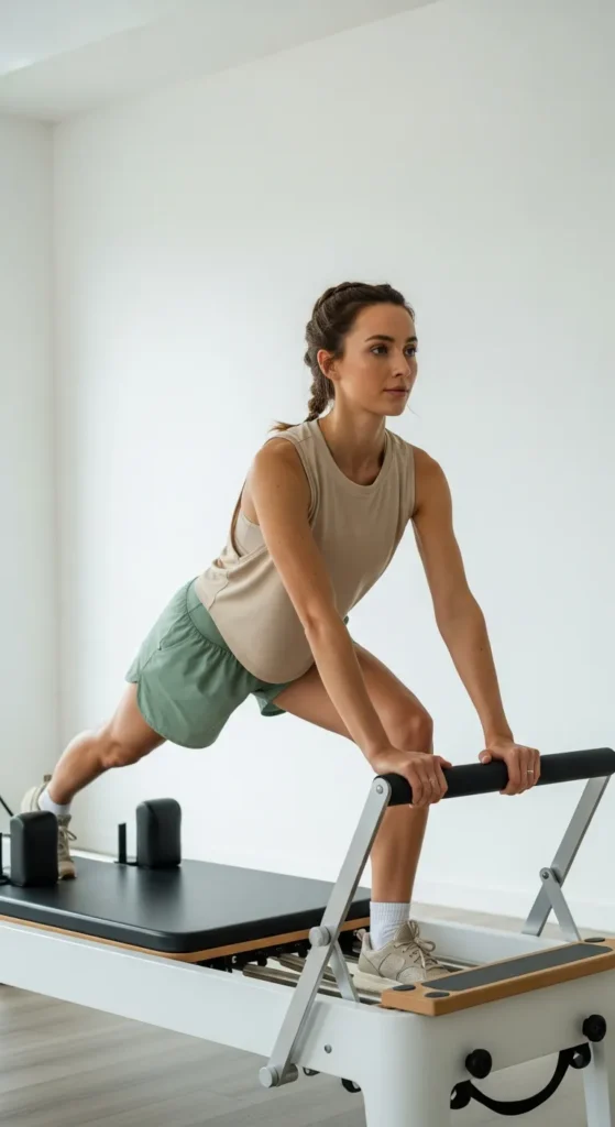 A fitted cream ribbed tank paired with chocolate brown bike shorts feels polished yet sporty. The earthy tones look sophisticated while the lightweight stretch fabrics keep you cool during core work and reformer exercises.
