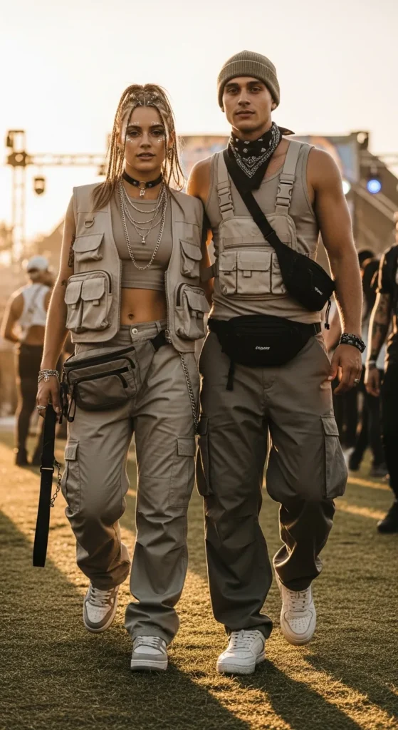 Utility-inspired cargo pants paired with fitted tops create a balanced silhouette. It’s functional, stylish, and perfect for couples who prefer comfort with an edge.