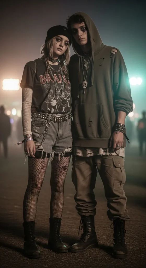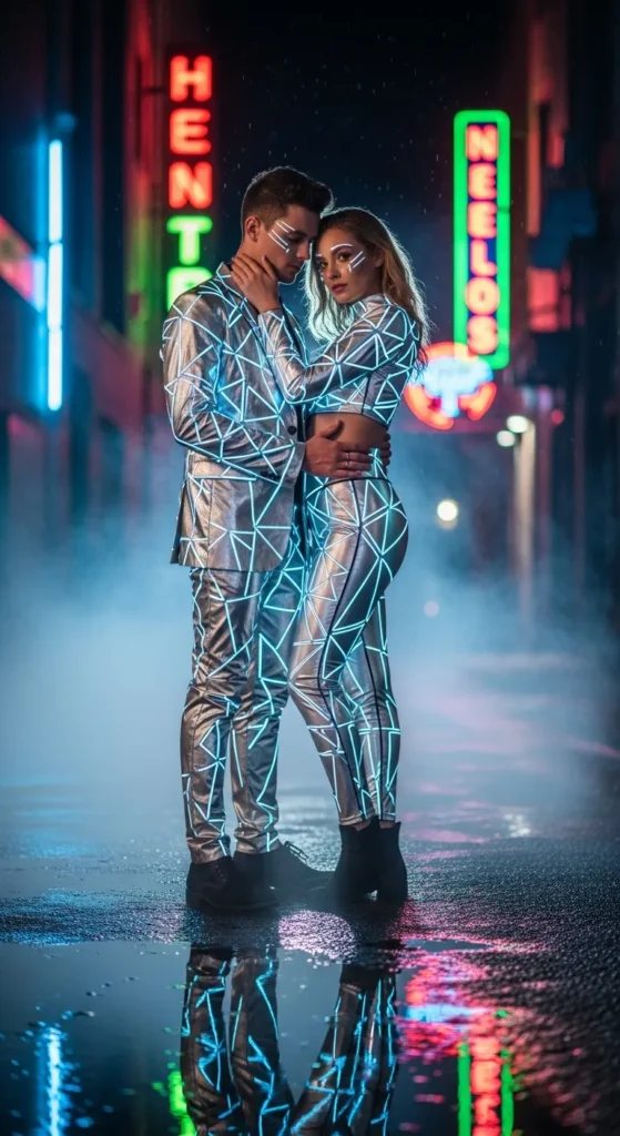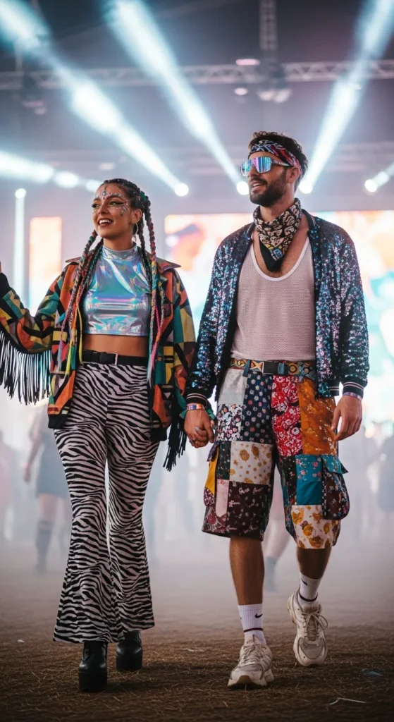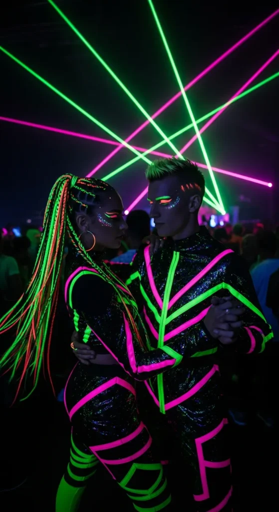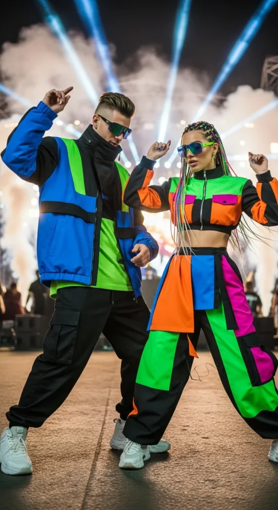 Bright neon pieces layered over neutral basics create a bold yet balanced couple style. It feels energetic and eye-catching without being overwhelming, perfect for standing out under flashing rave lights.