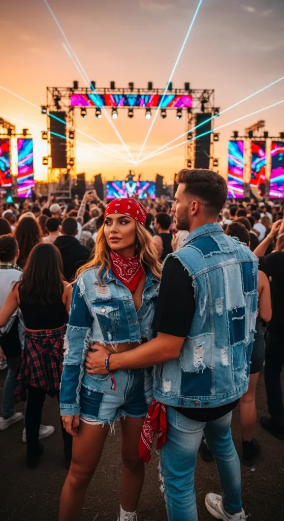 Reworked denim pieces like patchwork shorts and cropped jackets create a playful, coordinated look. It feels casual yet expressive, perfect for couples who want something familiar but still stand out in a crowd.
