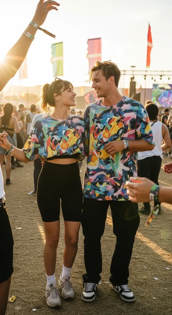 Coordinated graphic tees styled differently for each partner create a relaxed yet intentional vibe. It’s simple, fun, and perfect for couples who want a low-effort but meaningful connection in their outfits.
