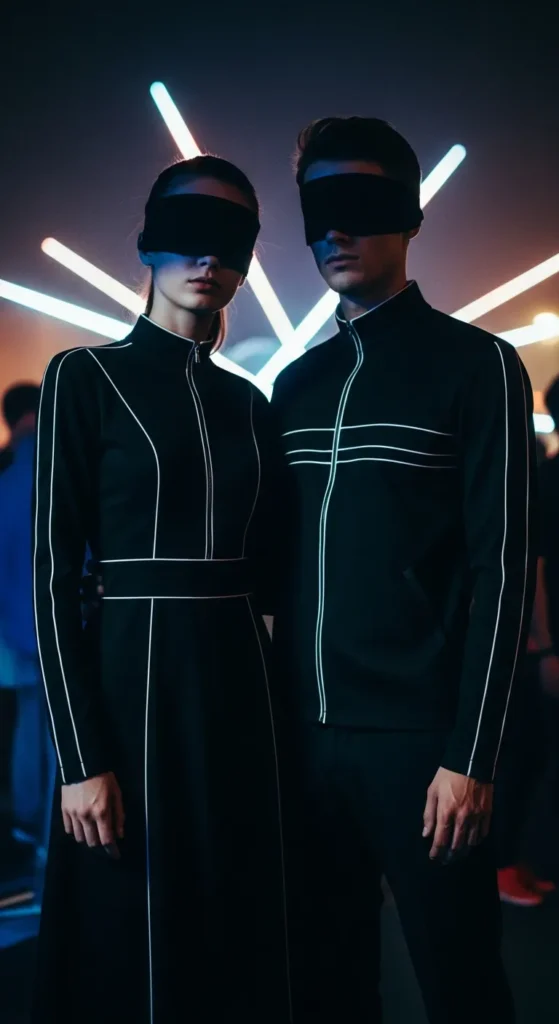 Simple black outfits styled differently create a sleek and timeless couple look. It’s understated but powerful in a vibrant rave setting.