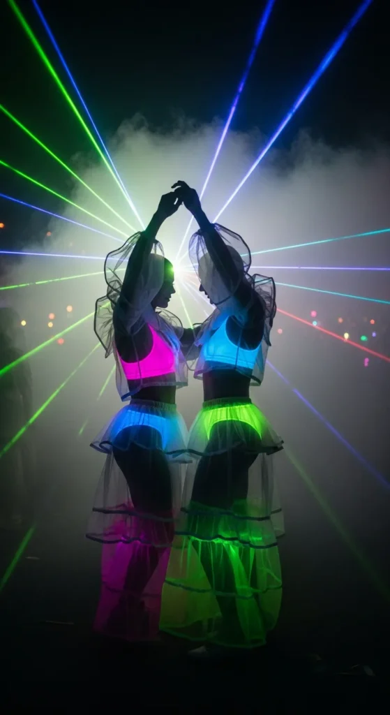 Stylist Suggestion: Use body shimmer because it catches light through sheer fabrics, adding dimension and making the outfit glow naturally under rave lighting.
