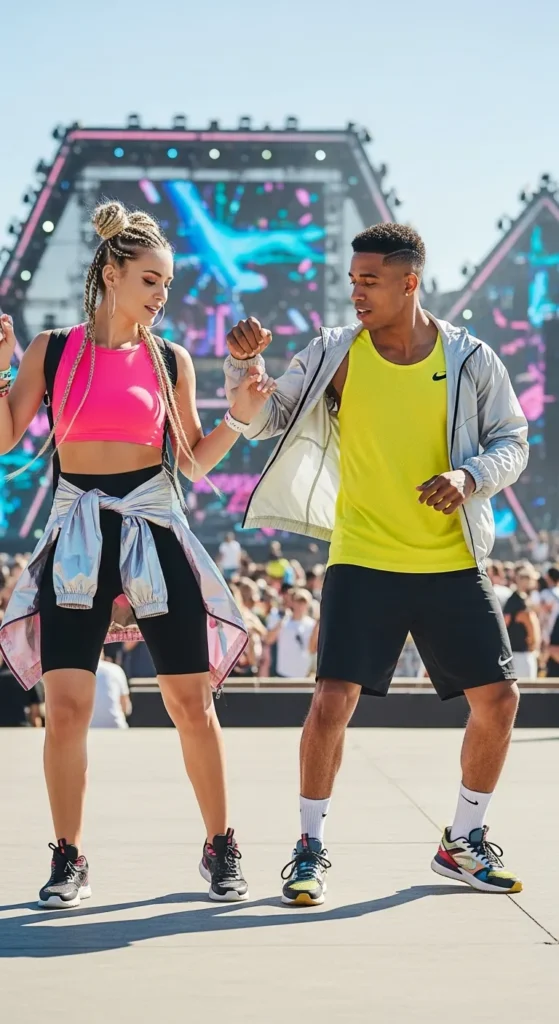 Athleisure-inspired pieces like biker shorts, tanks, and lightweight jackets bring a sporty edge to rave style. It’s practical for dancing while still looking coordinated and stylish.