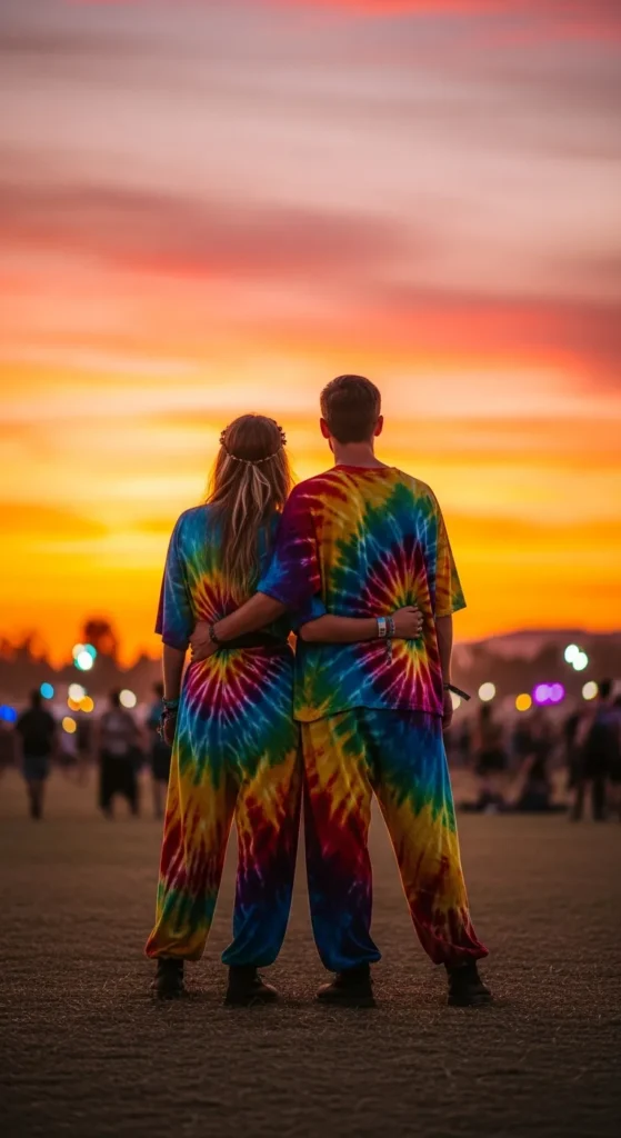 Soft tie-dye patterns in sunset shades create a warm, nostalgic vibe for couples. The colors blend beautifully, making the look feel effortless and naturally connected.