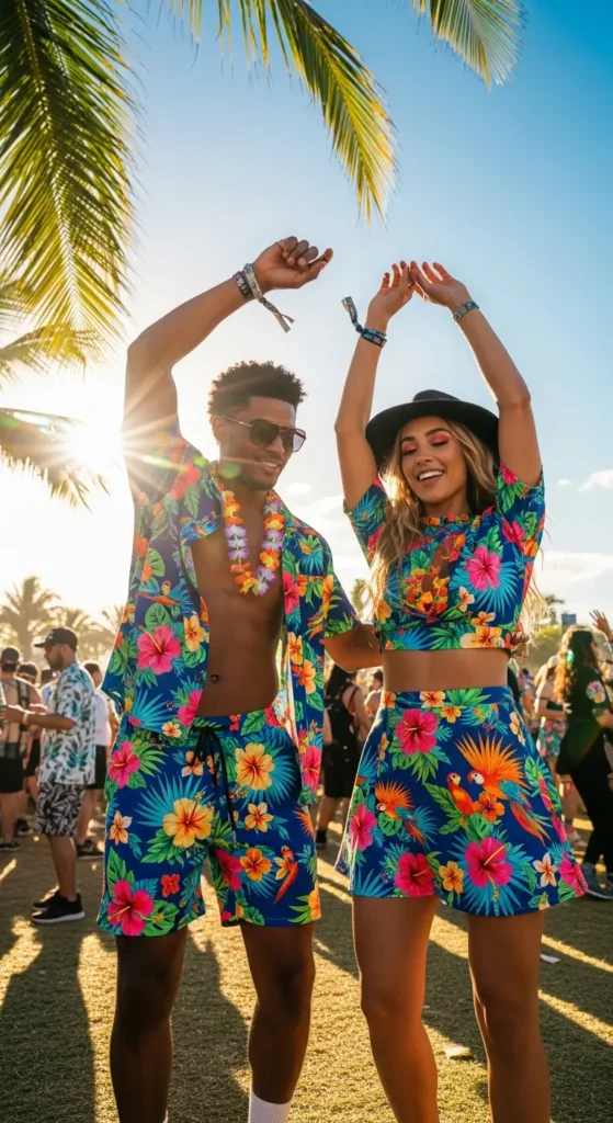 Bright tropical prints bring a vacation vibe to rave outfits. It’s fun, lively, and perfect for outdoor summer festivals.