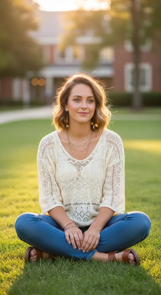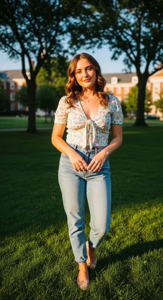 A lightweight floral tie-front blouse feels playful yet grown-up. Paired with classic mom jeans, it creates a balanced silhouette that’s flattering and perfect for warm lectures or casual lunch dates.