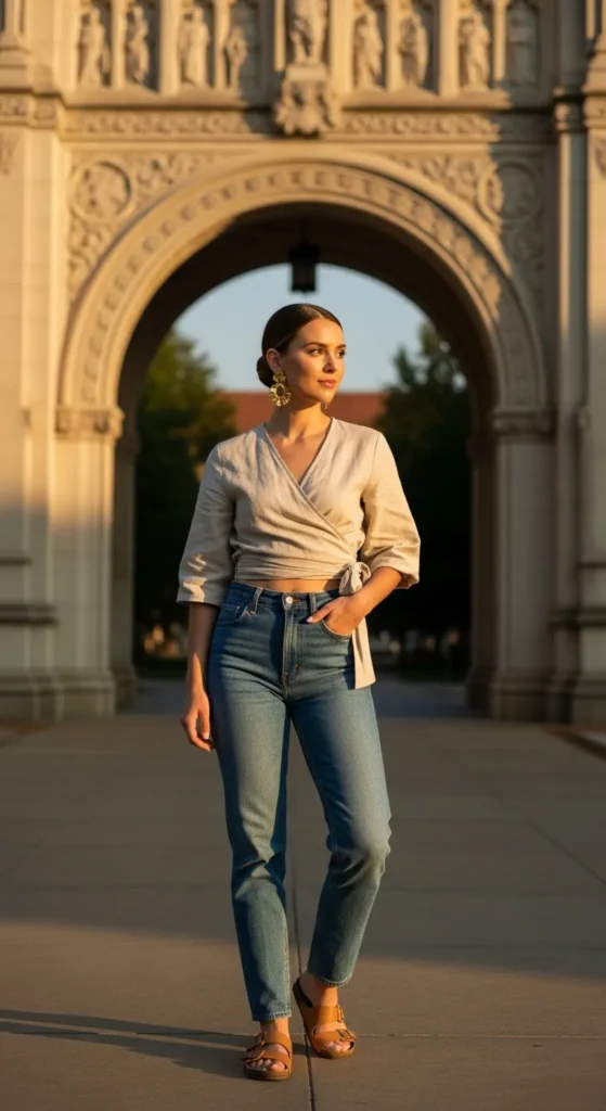 A linen wrap top feels breathable and subtly romantic. Combined with straight-leg jeans, it creates a timeless summer look that transitions easily from class to dinner.
