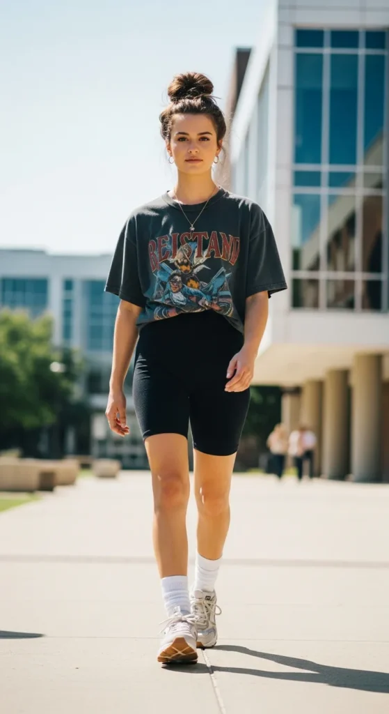 An oversized graphic tee tucked into biker shorts is comfortable yet trendy. It’s ideal for library days or quick errands between classes.