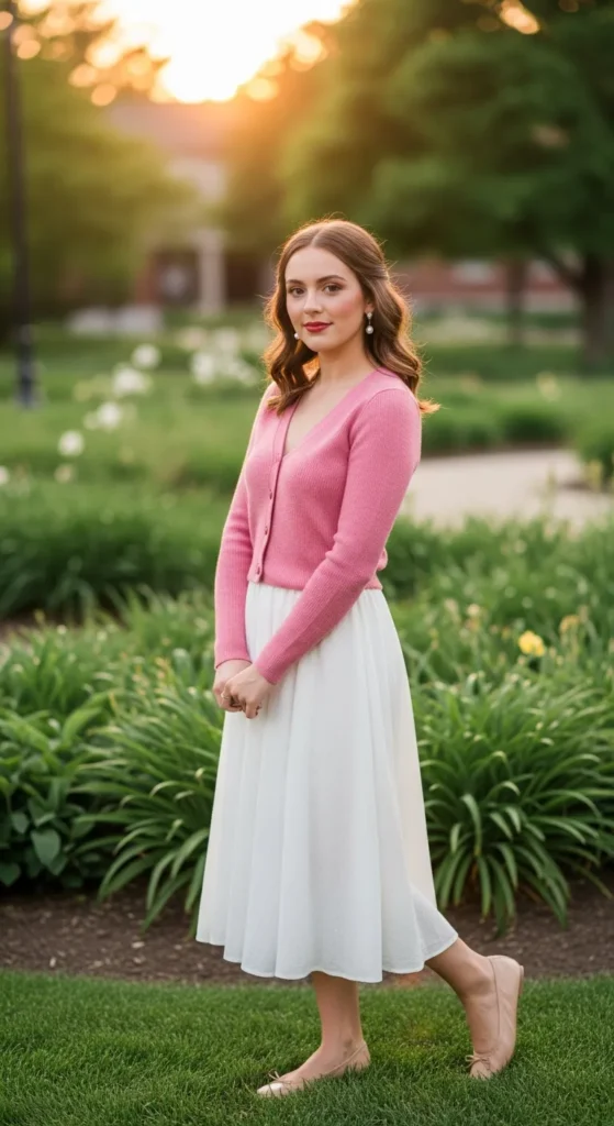 Wearing a pastel buttoned cardigan as a top feels feminine and soft. Styled with a flowy midi skirt, it’s romantic without feeling overdressed.