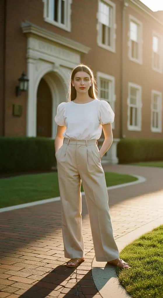 A breathable cotton puff sleeve top adds subtle drama while staying summer-friendly. Paired with flowy wide-leg trousers, the look feels polished yet comfortable enough for presentations or coffee runs.