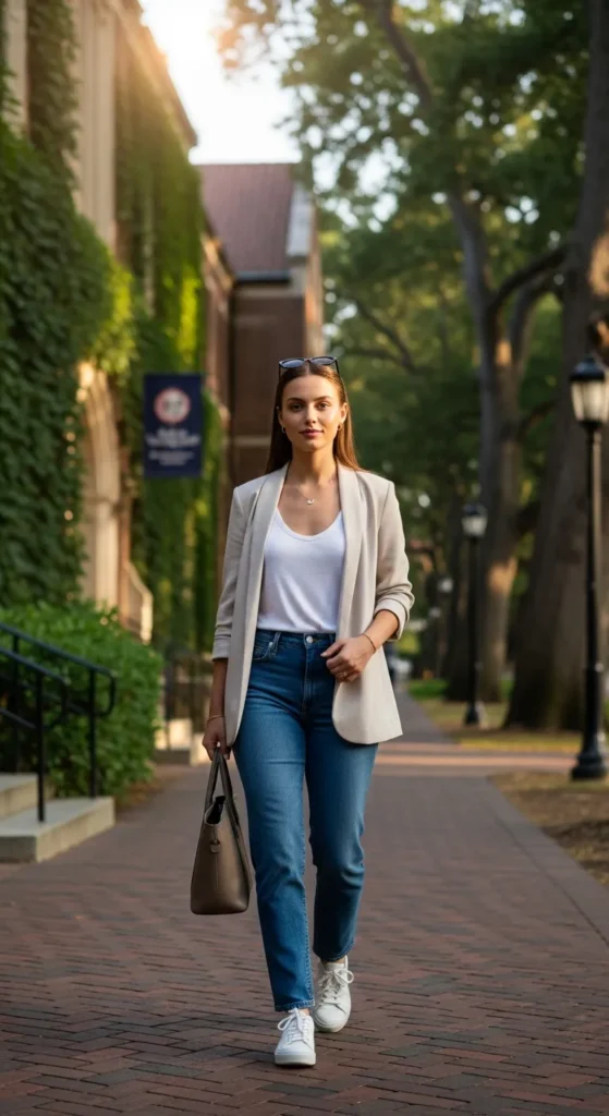 Stylist Suggestion: Choose sleek sneakers and a structured tote. The blazer already sharpens the look, so keeping accessories structured maintains balance.