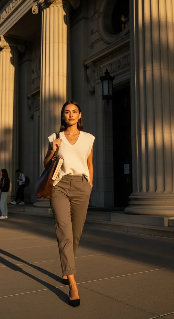 A sleeveless knit vest feels trendy yet polished for campus. Paired with relaxed trousers, it blends structure and comfort beautifully.